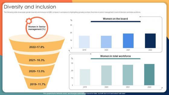 The following slide showcases gender diversity and inclusion at ABB companys workplace by highlighting growing number of women in senior management, board of directors and total workforce. Slidegeeks is here to make your presentations a breeze with Diversity And Inclusion Engineering Solution Provider Company Profile CP SS V With our easy-to-use and customizable templates, you can focus on delivering your ideas rather than worrying about formatting. With a variety of designs to choose from, you are sure to find one that suits your needs. And with animations and unique photos, illustrations, and fonts, you can make your presentation pop. So whether you are giving a sales pitch or presenting to the board, make sure to check out Slidegeeks first The following slide showcases gender diversity and inclusion at ABB companys workplace by highlighting growing number of women in senior management, board of directors and total workforce.