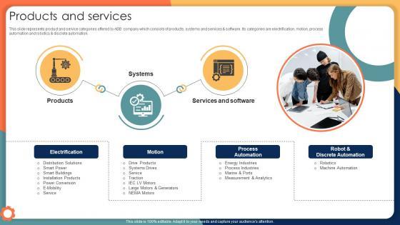 This slide represents product and service categories offered by ABB company which consists of products, systems and services and software. Its categories are electrification, motion, process automation and robotics and discrete automation. Retrieve professionally designed Products And Services Engineering Solution Provider Company Profile CP SS V to effectively convey your message and captivate your listeners. Save time by selecting pre-made slideshows that are appropriate for various topics, from business to educational purposes. These themes come in many different styles, from creative to corporate, and all of them are easily adjustable and can be edited quickly. Access them as PowerPoint templates or as Google Slides themes. You do not have to go on a hunt for the perfect presentation because Slidegeeks got you covered from everywhere. This slide represents product and service categories offered by ABB company which consists of products, systems and services and software. Its categories are electrification, motion, process automation and robotics and discrete automation.