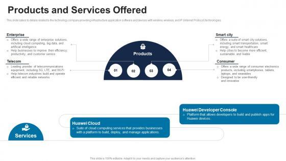 This slide caters to details related to the technology company providing infrastructure application software and devices with wireline, wireless, and IP Internet Protocol technologies. Coming up with a presentation necessitates that the majority of the effort goes into the content and the message you intend to convey. The visuals of a PowerPoint presentation can only be effective if it supplements and supports the story that is being told. Keeping this in mind our experts created Products And Services Offered ICT Solutions Provider Investor Funding Elevator Pitch Deck to reduce the time that goes into designing the presentation. This way, you can concentrate on the message while our designers take care of providing you with the right template for the situation. This slide caters to details related to the technology company providing infrastructure application software and devices with wireline, wireless, and IP Internet Protocol technologies.