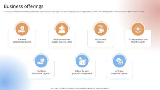 This slide presents the services offered by new digital payment startup company for users. It includes payment processing solutions, facilitates international payment, reliable customers support to assist users, etc. This slide presents the services offered by new digital payment startup company for users. It includes payment processing solutions, facilitates international payment, reliable customers support to assist users, etc. Slidegeeks is one of the best resources for PowerPoint templates. You can download easily and regulate Business Offerings Payment Gateway Provider Startup GTM Strategy GTM SS V for your personal presentations from our wonderful collection. A few clicks is all it takes to discover and get the most relevant and appropriate templates. Use our Templates to add a unique zing and appeal to your presentation and meetings. All the slides are easy to edit and you can use them even for advertisement purposes. This slide presents the services offered by new digital payment startup company for users. It includes payment processing solutions, facilitates international payment, reliable customers support to assist users, etc.