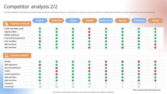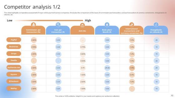The slide highlights comparative assessment of major online payment service companies. It includes the comparison on the basis of commission per transaction, cost per transactions and currency conversions, chargebacks on refunds, etc.The slide highlights comparative assessment of major online payment service companies. It includes the comparison on the basis of commission per transaction, cost per transactions & currency conversions, chargebacks on refunds, etc.Want to ace your presentation in front of a live audience Our Competitor Analysis Payment Gateway Provider Startup GTM Strategy GTM SS V can help you do that by engaging all the users towards you. Slidegeeks experts have put their efforts and expertise into creating these impeccable powerpoint presentations so that you can communicate your ideas clearly. Moreover, all the templates are customizable, and easy-to-edit and downloadable. Use these for both personal and commercial use. The slide highlights comparative assessment of major online payment service companies. It includes the comparison on the basis of commission per transaction, cost per transactions and currency conversions, chargebacks on refunds, etc.