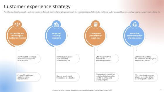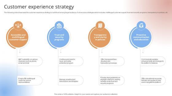 The following slide showcases the customer experience strategy to build trust among target audience. It showcases strategies which includes multilingual customer support, trust and security programs, transparency in policies, etc.The following slide showcases the customer experience strategy to build trust among target audience. It showcases strategies which includes multilingual customer support, trust and security programs, transparency in policies, etc.Get a simple yet stunning designed Customer Experience Strategy Payment Gateway Provider Startup GTM Strategy GTM SS V. It is the best one to establish the tone in your meetings. It is an excellent way to make your presentations highly effective. So, download this PPT today from Slidegeeks and see the positive impacts. Our easy-to-edit Customer Experience Strategy Payment Gateway Provider Startup GTM Strategy GTM SS V can be your go-to option for all upcoming conferences and meetings. So, what are you waiting for Grab this template today. The following slide showcases the customer experience strategy to build trust among target audience. It showcases strategies which includes multilingual customer support, trust and security programs, transparency in policies, etc.