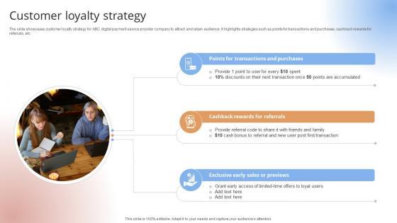 The slide showcases customer loyalty strategy for ABC digital payment service provider company to attract and retain audience. It highlights strategies such as points for transactions and purchases, cashback rewards for referrals, etc.The slide showcases customer loyalty strategy for ABC digital payment service provider company to attract and retain audience. It highlights strategies such as points for transactions and purchases, cashback rewards for referrals, etc.From laying roadmaps to briefing everything in detail, our templates are perfect for you. You can set the stage with your presentation slides. All you have to do is download these easy-to-edit and customizable templates. Customer Loyalty Strategy Payment Gateway Provider Startup GTM Strategy GTM SS V will help you deliver an outstanding performance that everyone would remember and praise you for. Do download this presentation today. The slide showcases customer loyalty strategy for ABC digital payment service provider company to attract and retain audience. It highlights strategies such as points for transactions and purchases, cashback rewards for referrals, etc.