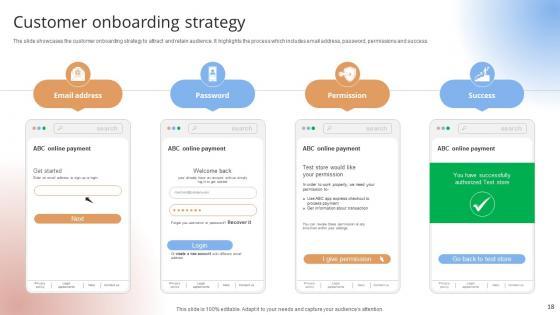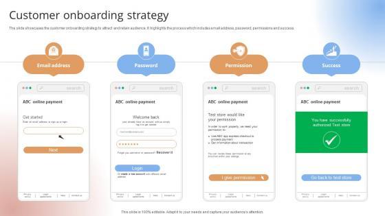 The slide showcases the customer onboarding strategy to attract and retain audience. It highlights the process which includes email address, password, permissions and success.The slide showcases the customer onboarding strategy to attract and retain audience. It highlights the process which includes email address, password, permissions and success.Present like a pro with Customer Onboarding Strategy Payment Gateway Provider Startup GTM Strategy GTM SS V. Create beautiful presentations together with your team, using our easy-to-use presentation slides. Share your ideas in real-time and make changes on the fly by downloading our templates. So whether you are in the office, on the go, or in a remote location, you can stay in sync with your team and present your ideas with confidence. With Slidegeeks presentation got a whole lot easier. Grab these presentations today. The slide showcases the customer onboarding strategy to attract and retain audience. It highlights the process which includes email address, password, permissions and success.