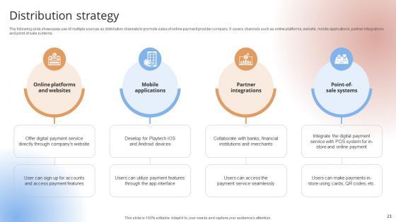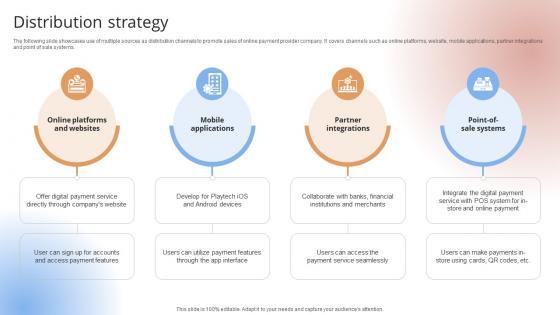 The following slide showcases use of multiple sources as distribution channels to promote sales of online payment provider company. It covers channels such as online platforms, website, mobile applications, partner integrations and point of sale systems.The following slide showcases use of multiple sources as distribution channels to promote sales of online payment provider company. It covers channels such as online platforms, website, mobile applications, partner integrations and point of sale systems.Slidegeeks is here to make your presentations a breeze with Distribution Strategy Payment Gateway Provider Startup GTM Strategy GTM SS V With our easy-to-use and customizable templates, you can focus on delivering your ideas rather than worrying about formatting. With a variety of designs to choose from, you are sure to find one that suits your needs. And with animations and unique photos, illustrations, and fonts, you can make your presentation pop. So whether you are giving a sales pitch or presenting to the board, make sure to check out Slidegeeks first The following slide showcases use of multiple sources as distribution channels to promote sales of online payment provider company. It covers channels such as online platforms, website, mobile applications, partner integrations and point of sale systems.