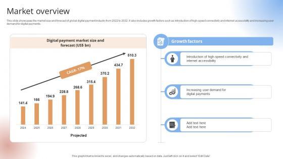 This slide showcases the market size and forecast of global digital payment industry from 2022 to 2032. It also includes growth factors such as introduction of high-speed connectivity and internet accessibility and increasing user demand for digital payments.This slide showcases the market size and forecast of global digital payment industry from 2022 to 2032. It also includes growth factors such as introduction of high-speed connectivity and internet accessibility and increasing user demand for digital payments.Crafting an eye-catching presentation has never been more straightforward. Let your presentation shine with this tasteful yet straightforward Market Overview Payment Gateway Provider Startup GTM Strategy GTM SS V template. It offers a minimalistic and classy look that is great for making a statement. The colors have been employed intelligently to add a bit of playfulness while still remaining professional. Construct the ideal Market Overview Payment Gateway Provider Startup GTM Strategy GTM SS V that effortlessly grabs the attention of your audience Begin now and be certain to wow your customers This slide showcases the market size and forecast of global digital payment industry from 2022 to 2032. It also includes growth factors such as introduction of high-speed connectivity and internet accessibility and increasing user demand for digital payments.