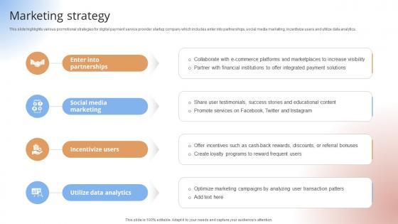 This slide highlights various promotional strategies for digital payment service provider startup company which includes enter into partnerships, social media marketing, incentivize users and utilize data analytics.This slide highlights various promotional strategies for digital payment service provider startup company which includes enter into partnerships, social media marketing, incentivize users and utilize data analytics.Formulating a presentation can take up a lot of effort and time, so the content and message should always be the primary focus. The visuals of the PowerPoint can enhance the presenters message, so our Marketing Strategy Payment Gateway Provider Startup GTM Strategy GTM SS V was created to help save time. Instead of worrying about the design, the presenter can concentrate on the message while our designers work on creating the ideal templates for whatever situation is needed. Slidegeeks has experts for everything from amazing designs to valuable content, we have put everything into Marketing Strategy Payment Gateway Provider Startup GTM Strategy GTM SS V. This slide highlights various promotional strategies for digital payment service provider startup company which includes enter into partnerships, social media marketing, incentivize users and utilize data analytics.