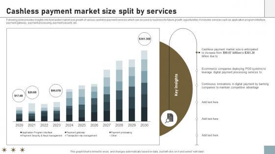 Following slide provides insights into forecasted market size growth of various cashless payment services which can be used by business for future growth opportunities. It includes services such as application program interface, payment gateway, payment processing, payment security, etc. Take your projects to the next level with our ultimate collection of Online Payment Techniques For Providing Cashless Payment Market Size Split. Slidegeeks has designed a range of layouts that are perfect for representing task or activity duration, keeping track of all your deadlines at a glance. Tailor these designs to your exact needs and give them a truly corporate look with your own brand colors they will make your projects stand out from the rest Following slide provides insights into forecasted market size growth of various cashless payment services which can be used by business for future growth opportunities. It includes services such as application program interface, payment gateway, payment processing, payment security, etc.