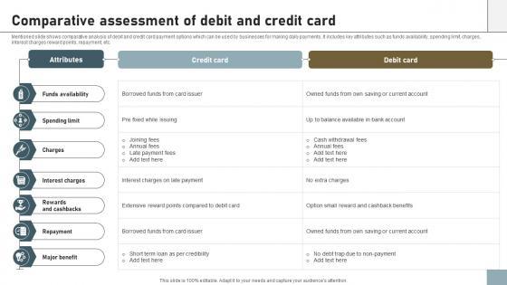Mentioned slide shows comparative analysis of debit and credit card payment options which can be used by businesses for making daily payments. It includes key attributes such as funds availability, spending limit, charges, interest charges reward points, repayment, etc. Do you know about Slidesgeeks Online Payment Techniques For Providing Comparative Assessment Of Debit These are perfect for delivering any kind od presentation. Using it, create PowerPoint presentations that communicate your ideas and engage audiences. Save time and effort by using our pre-designed presentation templates that are perfect for a wide range of topic. Our vast selection of designs covers a range of styles, from creative to business, and are all highly customizable and easy to edit. Download as a PowerPoint template or use them as Google Slides themes. Mentioned slide shows comparative analysis of debit and credit card payment options which can be used by businesses for making daily payments. It includes key attributes such as funds availability, spending limit, charges, interest charges reward points, repayment, etc.