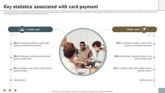 Following slide provides insights into credit and debit card payment card usage by customers which can be used by businesses to determine promotional offers for increasing sales. It includes key points such as card usage for ecommerce payment, physical card users, and virtual card users. Find a pre-designed and impeccable Online Payment Techniques For Providing Key Statistics Associated With Card. The templates can ace your presentation without additional effort. You can download these easy-to-edit presentation templates to make your presentation stand out from others. So, what are you waiting for Download the template from Slidegeeks today and give a unique touch to your presentation. Following slide provides insights into credit and debit card payment card usage by customers which can be used by businesses to determine promotional offers for increasing sales. It includes key points such as card usage for ecommerce payment, physical card users, and virtual card users.