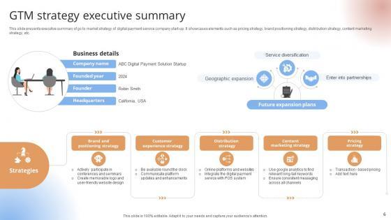 This slide presents executive summary of go to market strategy of digital payment service company start-up. It showcases elements such as pricing strategy, brand positioning strategy, distribution strategy, content marketing strategy, etc.This slide presents executive summary of go to market strategy of digital payment service company start-up. It showcases elements such as pricing strategy, brand positioning strategy, distribution strategy, content marketing strategy, etc.If your project calls for a presentation, then Slidegeeks is your go-to partner because we have professionally designed, easy-to-edit templates that are perfect for any presentation. After downloading, you can easily edit GTM Strategy Executive Summary Payment Gateway Provider Startup GTM Strategy GTM SS V and make the changes accordingly. You can rearrange slides or fill them with different images. Check out all the handy templates This slide presents executive summary of go to market strategy of digital payment service company start-up. It showcases elements such as pricing strategy, brand positioning strategy, distribution strategy, content marketing strategy, etc.