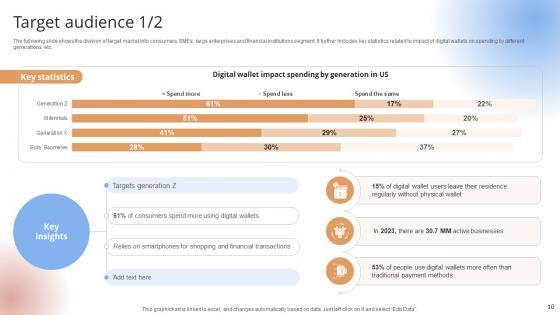 The following slide shows the division of target market into consumers, SMEs, large enterprises and financial institutions segment. It further includes key statistics related to impact of digital wallets on spending by different generations, etc.The following slide shows the division of target market into consumers, SMEs, large enterprises and financial institutions segment. It further includes key statistics related to impact of digital wallets on spending by different generations, etc.The best PPT templates are a great way to save time, energy, and resources. Slidegeeks have 100 percent editable powerpoint slides making them incredibly versatile. With these quality presentation templates, you can create a captivating and memorable presentation by combining visually appealing slides and effectively communicating your message. Download Target Audience Payment Gateway Provider Startup GTM Strategy GTM SS V from Slidegeeks and deliver a wonderful presentation. The following slide shows the division of target market into consumers, SMEs, large enterprises and financial institutions segment. It further includes key statistics related to impact of digital wallets on spending by different generations, etc.