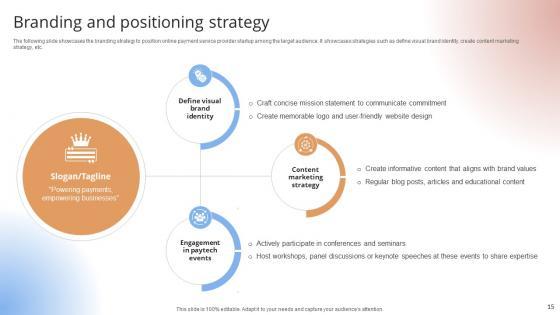The following slide showcases the branding strategy to position online payment service provider startup among the target audience. It showcases strategies such as define visual brand identity, create content marketing strategy, etc.The following slide showcases the branding strategy to position online payment service provider startup among the target audience. It showcases strategies such as define visual brand identity, create content marketing strategy, etc.Boost your pitch with our creative Branding And Positioning Strategy Payment Gateway Provider Startup GTM Strategy GTM SS V. Deliver an awe-inspiring pitch that will mesmerize everyone. Using these presentation templates you will surely catch everyones attention. You can browse the ppts collection on our website. We have researchers who are experts at creating the right content for the templates. So you do not have to invest time in any additional work. Just grab the template now and use them. The following slide showcases the branding strategy to position online payment service provider startup among the target audience. It showcases strategies such as define visual brand identity, create content marketing strategy, etc.