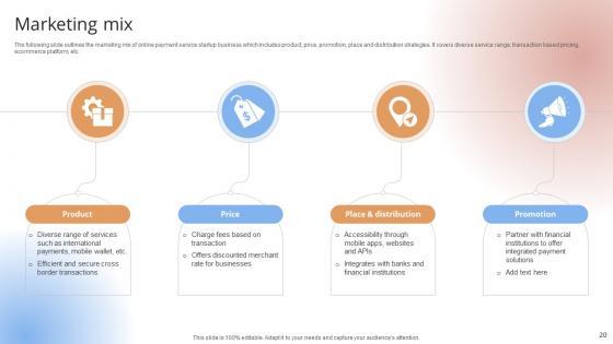 The following slide outlines the marketing mix of online payment service startup business which includes product, price, promotion, place and distribution strategies. It covers diverse service range, transaction based pricing, ecommerce platform, etc.The following slide outlines the marketing mix of online payment service startup business which includes product, price, promotion, place and distribution strategies. It covers diverse service range, transaction based pricing, ecommerce platform, etc.Make sure to capture your audiences attention in your business displays with our gratis customizable Marketing Mix Payment Gateway Provider Startup GTM Strategy GTM SS V. These are great for business strategies, office conferences, capital raising or task suggestions. If you desire to acquire more customers for your tech business and ensure they stay satisfied, create your own sales presentation with these plain slides. The following slide outlines the marketing mix of online payment service startup business which includes product, price, promotion, place and distribution strategies. It covers diverse service range, transaction based pricing, ecommerce platform, etc.