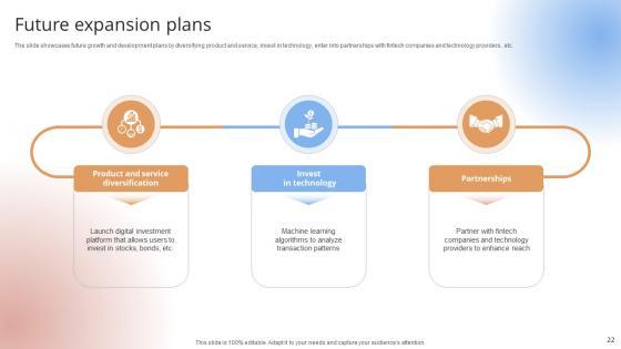 The slide showcases future growth and development plans by diversifying product and service, invest in technology, enter into partnerships with fintech companies and technology providers , etc.The slide showcases future growth and development plans by diversifying product and service, invest in technology, enter into partnerships with fintech companies and technology providers , etc.Whether you have daily or monthly meetings, a brilliant presentation is necessary. Future Expansion Plans Payment Gateway Provider Startup GTM Strategy GTM SS V can be your best option for delivering a presentation. Represent everything in detail using Future Expansion Plans Payment Gateway Provider Startup GTM Strategy GTM SS V and make yourself stand out in meetings. The template is versatile and follows a structure that will cater to your requirements. All the templates prepared by Slidegeeks are easy to download and edit. Our research experts have taken care of the corporate themes as well. So, give it a try and see the results. The slide showcases future growth and development plans by diversifying product and service, invest in technology, enter into partnerships with fintech companies and technology providers , etc.