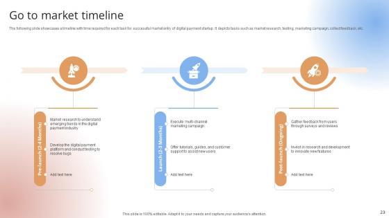 The following slide showcases a timeline with time required for each task for successful market entry of digital payment startup. It depicts tasks such as market research, testing, marketing campaign, collect feedback, etc.The following slide showcases a timeline with time required for each task for successful market entry of digital payment startup. It depicts tasks such as market research, testing, marketing campaign, collect feedback, etc.Find highly impressive Go To Market Timeline Payment Gateway Provider Startup GTM Strategy GTM SS V on Slidegeeks to deliver a meaningful presentation. You can save an ample amount of time using these presentation templates. No need to worry to prepare everything from scratch because Slidegeeks experts have already done a huge research and work for you. You need to download Go To Market Timeline Payment Gateway Provider Startup GTM Strategy GTM SS V for your upcoming presentation. All the presentation templates are 100 percent editable and you can change the color and personalize the content accordingly. Download now The following slide showcases a timeline with time required for each task for successful market entry of digital payment startup. It depicts tasks such as market research, testing, marketing campaign, collect feedback, etc.