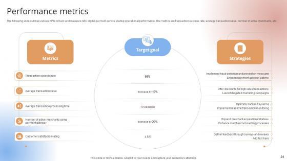 The following slide outlines various KPIs to track and measure ABC digital payment service startup operational performance. The metrics are transaction success rate, average transaction value, number of active merchants, etc.The following slide outlines various KPIs to track and measure ABC digital payment service startup operational performance. The metrics are transaction success rate, average transaction value, number of active merchants, etc.Coming up with a presentation necessitates that the majority of the effort goes into the content and the message you intend to convey. The visuals of a PowerPoint presentation can only be effective if it supplements and supports the story that is being told. Keeping this in mind our experts created Performance Metrics Payment Gateway Provider Startup GTM Strategy GTM SS V to reduce the time that goes into designing the presentation. This way, you can concentrate on the message while our designers take care of providing you with the right template for the situation. The following slide outlines various KPIs to track and measure ABC digital payment service startup operational performance. The metrics are transaction success rate, average transaction value, number of active merchants, etc.