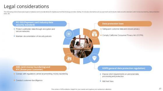 The following slide showcases legal compliance and considerations for digital payment technology provider startup. It includes elements such as payment card industry data security standard, anti-money laundering, data protection laws, etc.The following slide showcases legal compliance and considerations for digital payment technology provider startup. It includes elements such as payment card industry data security standard, anti-money laundering, data protection laws, etc.Are you in need of a template that can accommodate all of your creative concepts This one is crafted professionally and can be altered to fit any style. Use it with Google Slides or PowerPoint. Include striking photographs, symbols, depictions, and other visuals. Fill, move around, or remove text boxes as desired. Test out color palettes and font mixtures. Edit and save your work, or work with colleagues. Download Legal Considerations Payment Gateway Provider Startup GTM Strategy GTM SS V and observe how to make your presentation outstanding. Give an impeccable presentation to your group and make your presentation unforgettable. The following slide showcases legal compliance and considerations for digital payment technology provider startup. It includes elements such as payment card industry data security standard, anti-money laundering, data protection laws, etc.