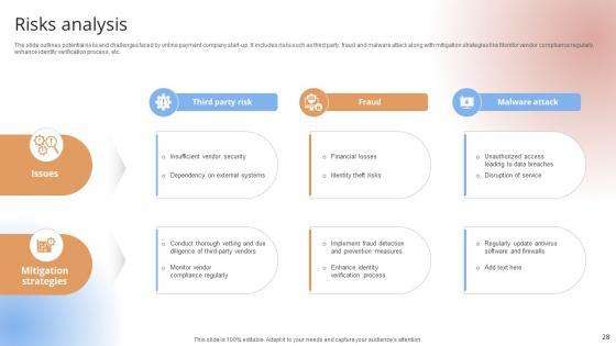 The slide outlines potential risks and challenges faced by online payment company start-up. It includes risks such as third party, fraud and malware attack along with mitigation strategies like Monitor vendor compliance regularly, enhance identity verification process, etc.The slide outlines potential risks and challenges faced by online payment company start-up. It includes risks such as third party, fraud and malware attack along with mitigation strategies like Monitor vendor compliance regularly, enhance identity verification process, etc.Welcome to our selection of the Risks Analysis Payment Gateway Provider Startup GTM Strategy GTM SS V. These are designed to help you showcase your creativity and bring your sphere to life. Planning and Innovation are essential for any business that is just starting out. This collection contains the designs that you need for your everyday presentations. All of our PowerPoints are 100 percent editable, so you can customize them to suit your needs. This multi-purpose template can be used in various situations. Grab these presentation templates today. The slide outlines potential risks and challenges faced by online payment company start-up. It includes risks such as third party, fraud and malware attack along with mitigation strategies like Monitor vendor compliance regularly, enhance identity verification process, etc.