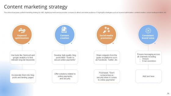 The slide showcases content marketing strategy for ABC digital payment service provider company to attract and retain audience. It highlights strategies such as keyword optimization, content creation, social media promotion, etc.The slide showcases content marketing strategy for ABC digital payment service provider company to attract and retain audience. It highlights strategies such as keyword optimization, content creation, social media promotion, etc.There are so many reasons you need a Content Marketing Strategy Payment Gateway Provider Startup GTM Strategy GTM SS V. The first reason is you can not spend time making everything from scratch, Thus, Slidegeeks has made presentation templates for you too. You can easily download these templates from our website easily. The slide showcases content marketing strategy for ABC digital payment service provider company to attract and retain audience. It highlights strategies such as keyword optimization, content creation, social media promotion, etc.