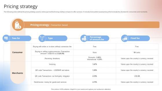 The following slide outlines the pricing strategy used by online payment technology startup company to offer services. It includes transaction based pricing which includes fee structure for consumers and merchants.The following slide outlines the pricing strategy used by online payment technology startup company to offer services. It includes transaction based pricing which includes fee structure for consumers and merchants.This modern and well-arranged Pricing Strategy Payment Gateway Provider Startup GTM Strategy GTM SS V provides lots of creative possibilities. It is very simple to customize and edit with the Powerpoint Software. Just drag and drop your pictures into the shapes. All facets of this template can be edited with Powerpoint, no extra software is necessary. Add your own material, put your images in the places assigned for them, adjust the colors, and then you can show your slides to the world, with an animated slide included. The following slide outlines the pricing strategy used by online payment technology startup company to offer services. It includes transaction based pricing which includes fee structure for consumers and merchants.