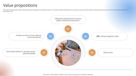 This slide showcases the unique value proposition of digital payment startup company. It includes user friendly interface to send and receive payments globally, safeguard businesses and consumers against unauthorized transactions, etc.This slide showcases the unique value proposition of digital payment startup company. It includes user friendly interface to send and receive payments globally, safeguard businesses and consumers against unauthorized transactions, etc.The Value Propositions Payment Gateway Provider Startup GTM Strategy GTM SS V is a compilation of the most recent design trends as a series of slides. It is suitable for any subject or industry presentation, containing attractive visuals and photo spots for businesses to clearly express their messages. This template contains a variety of slides for the user to input data, such as structures to contrast two elements, bullet points, and slides for written information. Slidegeeks is prepared to create an impression. This slide showcases the unique value proposition of digital payment startup company. It includes user friendly interface to send and receive payments globally, safeguard businesses and consumers against unauthorized transactions, etc.