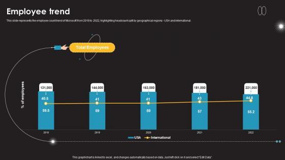 This slide represents the employee count trend of Microsoft from 2018 to 2022, highlighting headcount split by geographical regions - USA and international.From laying roadmaps to briefing everything in detail, our templates are perfect for you. You can set the stage with your presentation slides. All you have to do is download these easy-to-edit and customizable templates. Employee Trend Information Technology Services Provider Company Profile CP SS V will help you deliver an outstanding performance that everyone would remember and praise you for. Do download this presentation today. This slide represents the employee count trend of Microsoft from 2018 to 2022, highlighting headcount split by geographical regions - USA and international.