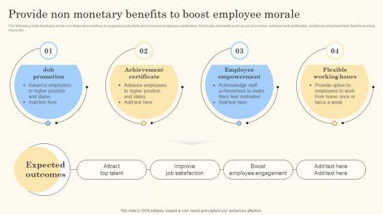 The following slide illustrates some non financial incentives to upgrade productivity and increase employee satisfaction. It includes elements such as job promotion, achievement certificates, employee empowerment, flexible working hours etc. Present like a pro with Tactical Employee Engagement Action Planning Provide Non Monetary Benefits To Boost Employee Morale Structure PDF Create beautiful presentations together with your team, using our easy to use presentation slides. Share your ideas in real time and make changes on the fly by downloading our templates. So whether you are in the office, on the go, or in a remote location, you can stay in sync with your team and present your ideas with confidence. With Slidegeeks presentation got a whole lot easier. Grab these presentations today.