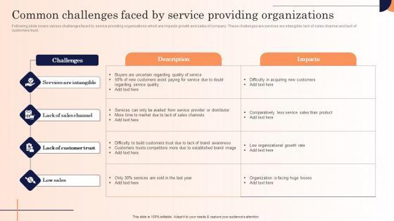 Following slide covers various challenges faced by service providing organizations which are impacts growth and sales of company. These challenges are services are intangible, lack of sales channel and lack of customers trust.Whether you have daily or monthly meetings, a brilliant presentation is necessary. Common Challenges Faced By Service Providing Strategic Marketing Campaign Icons Pdf can be your best option for delivering a presentation. Represent everything in detail using Common Challenges Faced By Service Providing Strategic Marketing Campaign Icons Pdf and make yourself stand out in meetings. The template is versatile and follows a structure that will cater to your requirements. All the templates prepared by Slidegeeks are easy to download and edit. Our research experts have taken care of the corporate themes as well. So, give it a try and see the results. Following slide covers various challenges faced by service providing organizations which are impacts growth and sales of company. These challenges are services are intangible, lack of sales channel and lack of customers trust.