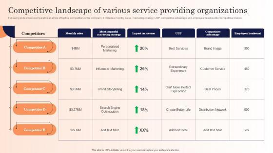 Following slide shows comparative analysis of top five competitors of the company. It includes monthly sales, marketing strategy, USP, competitive advantage and employee headcount of competitive brands.Find highly impressive Competitive Landscape Of Various Service Providing Strategic Marketing Campaign Diagrams Pdf on Slidegeeks to deliver a meaningful presentation. You can save an ample amount of time using these presentation templates. No need to worry to prepare everything from scratch because Slidegeeks experts have already done a huge research and work for you. You need to download Competitive Landscape Of Various Service Providing Strategic Marketing Campaign Diagrams Pdf for your upcoming presentation. All the presentation templates are 100Precent editable and you can change the color and personalize the content accordingly. Download now. Following slide shows comparative analysis of top five competitors of the company. It includes monthly sales, marketing strategy, USP, competitive advantage and employee headcount of competitive brands.