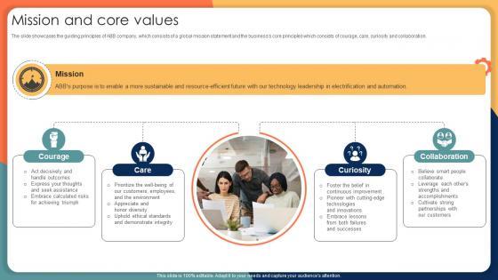 The slide showcases the guiding principles of ABB company, which consists of a global mission statement and the businesss core principles which consists of courage, care, curiosity and collaboration. This Mission And Core Values Engineering Solution Provider Company Profile CP SS V is perfect for any presentation, be it in front of clients or colleagues. It is a versatile and stylish solution for organizing your meetings. The Mission And Core Values Engineering Solution Provider Company Profile CP SS V features a modern design for your presentation meetings. The adjustable and customizable slides provide unlimited possibilities for acing up your presentation. Slidegeeks has done all the homework before launching the product for you. So, do not wait, grab the presentation templates today The slide showcases the guiding principles of ABB company, which consists of a global mission statement and the businesss core principles which consists of courage, care, curiosity and collaboration.