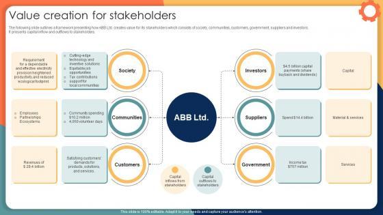The following slide outlines a framework presenting how ABB Ltd. creates value for its stakeholders which consists of society, communities, customers, government, suppliers and investors. It presents capital inflow and outflows to stakeholders. From laying roadmaps to briefing everything in detail, our templates are perfect for you. You can set the stage with your presentation slides. All you have to do is download these easy-to-edit and customizable templates. Value Creation For Stakeholders Engineering Solution Provider Company Profile CP SS V will help you deliver an outstanding performance that everyone would remember and praise you for. Do download this presentation today. The following slide outlines a framework presenting how ABB Ltd. creates value for its stakeholders which consists of society, communities, customers, government, suppliers and investors. It presents capital inflow and outflows to stakeholders.
