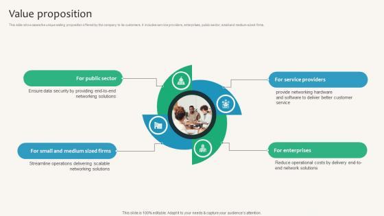 This slide showcases the unique selling proposition offered by the company to its customers. It includes service providers, enterprises, public sector, small and medium-sized firms. Are you in need of a template that can accommodate all of your creative concepts This one is crafted professionally and can be altered to fit any style. Use it with Google Slides or PowerPoint. Include striking photographs, symbols, depictions, and other visuals. Fill, move around, or remove text boxes as desired. Test out color palettes and font mixtures. Edit and save your work, or work with colleagues. Download Value Proposition Cloud Networking Service Provider Business Model BMC SS V and observe how to make your presentation outstanding. Give an impeccable presentation to your group and make your presentation unforgettable. This slide showcases the unique selling proposition offered by the company to its customers. It includes service providers, enterprises, public sector, small and medium-sized firms.