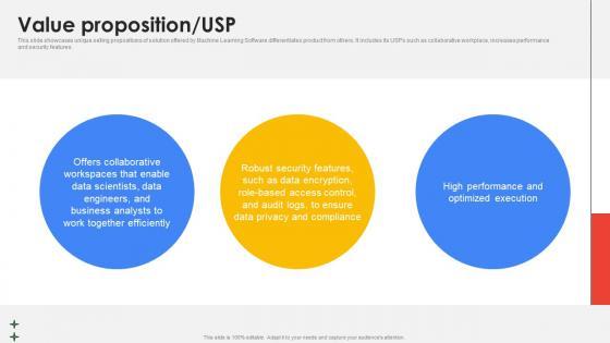 This slide showcases unique selling propositions of solution offered by Machine Learning Software differentiates product from others. It includes its USPs such as collaborative workplace, increases performance and security features. Welcome to our selection of the Value Proposition Usp Cloud Platform Provider Investor Funding Elevator Microsoft Pdf. These are designed to help you showcase your creativity and bring your sphere to life. Planning and Innovation are essential for any business that is just starting out. This collection contains the designs that you need for your everyday presentations. All of our PowerPoints are 100 percent editable, so you can customize them to suit your needs. This multi-purpose template can be used in various situations. Grab these presentation templates today This slide showcases unique selling propositions of solution offered by Machine Learning Software differentiates product from others. It includes its USPs such as collaborative workplace, increases performance and security features.