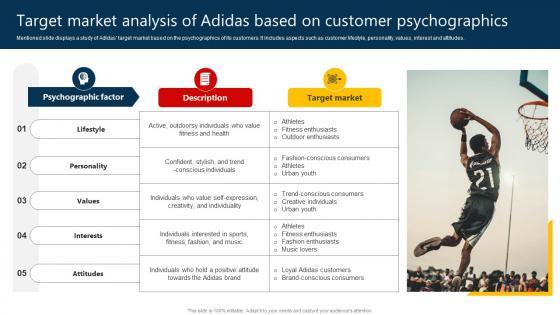 Mentioned slide displays a study of Adidas target market based on the psychographics of its customers. It includes aspects such as customer lifestyle, personality, values, interest and attitudes. This Target Market Analysis Of Adidas Based On Customer Psychographics Strategy SS V is perfect for any presentation, be it in front of clients or colleagues. It is a versatile and stylish solution for organizing your meetings. The Target Market Analysis Of Adidas Based On Customer Psychographics Strategy SS V features a modern design for your presentation meetings. The adjustable and customizable slides provide unlimited possibilities for acing up your presentation. Slidegeeks has done all the homework before launching the product for you. So, do not wait, grab the presentation templates today Mentioned slide displays a study of Adidas target market based on the psychographics of its customers. It includes aspects such as customer lifestyle, personality, values, interest and attitudes.