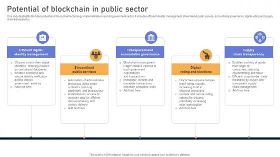 This slide highlights the future potential of blockchain technology implementation in public or government sector. It includes efficient identity management, streamlined public service, accountable governance, digital voting and supply chain transparency. Slidegeeks is one of the best resources for PowerPoint templates. You can download easily and regulate Comprehensive Look At Blockchain Potential Of Blockchain In Public Sector BCT SS V for your personal presentations from our wonderful collection. A few clicks is all it takes to discover and get the most relevant and appropriate templates. Use our Templates to add a unique zing and appeal to your presentation and meetings. All the slides are easy to edit and you can use them even for advertisement purposes. This slide highlights the future potential of blockchain technology implementation in public or government sector. It includes efficient identity management, streamlined public service, accountable governance, digital voting and supply chain transparency.