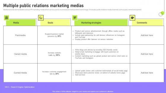 Mentioned slide demonstrates various PR marketing media which can be used by businesses to build positive brand image. It includes public relations media channels such as paid, owned and earned. Do you know about Slidesgeeks Multiple Public Relations Marketing Deployment Of Marketing Communication Download Pdf These are perfect for delivering any kind od presentation. Using it, create PowerPoint presentations that communicate your ideas and engage audiences. Save time and effort by using our pre designed presentation templates that are perfect for a wide range of topic. Our vast selection of designs covers a range of styles, from creative to business, and are all highly customizable and easy to edit. Download as a PowerPoint template or use them as Google Slides themes. Mentioned slide demonstrates various PR marketing media which can be used by businesses to build positive brand image. It includes public relations media channels such as paid, owned and earned.