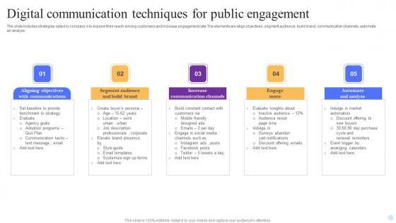 The slide includes strategies opted by companys to expand their reach among customers and increase engagement rate.The elements are align objectives, segment audience, build brand, communication channels, automate an analyze. Showcasing this set of slides titled Digital Communication Techniques For Public Engagement Summary Pdf. The topics addressed in these templates are Aligning Objectives, Communications, Segment Audience, Build Brand. All the content presented in this PPT design is completely editable. Download it and make adjustments in color, background, font etc. as per your unique business setting. The slide includes strategies opted by companys to expand their reach among customers and increase engagement rate. The elements are align objectives, segment audience, build brand, communication channels, automate an analyze.