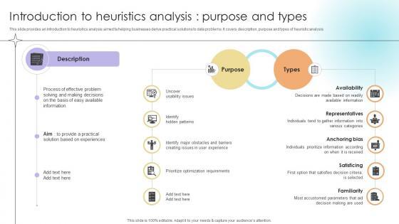 This slide provides an introduction to heuristics analysis aimed ta helping businesses derive practical solutions to data problems. It covers description, purpose and types of heuristic analysis.There are so many reasons you need a Introduction To Heuristics Analysis Purpose And Types Data Analytics SS V. The first reason is you can not spend time making everything from scratch, Thus, Slidegeeks has made presentation templates for you too. You can easily download these templates from our website easily. This slide provides an introduction to heuristics analysis aimed ta helping businesses derive practical solutions to data problems. It covers description, purpose and types of heuristic analysis.