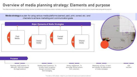 This slide showcases media planning strategy overview essential for providing basic idea to marketers. It provides information about paid, owned, earned, shared media along with its purpose. Do you have an important presentation coming up Are you looking for something that will make your presentation stand out from the rest Look no further than Overview Of Media Planning Strategy Elements And Purpose Rules PDF. With our professional designs, you can trust that your presentation will pop and make delivering it a smooth process. And with Slidegeeks, you can trust that your presentation will be unique and memorable. So why wait Grab Overview Of Media Planning Strategy Elements And Purpose Rules PDF today and make your presentation stand out from the rest.