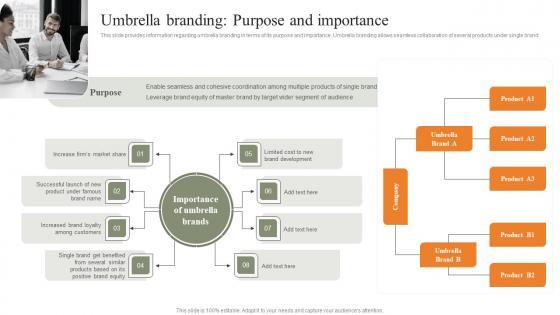 This slide provides information regarding umbrella branding in terms of its purpose and importance. Umbrella branding allows seamless collaboration of several products under single brand. Do you know about Slidesgeeks Umbrella Branding Purpose And Importance Strategies For Achieving Template Pdf These are perfect for delivering any kind od presentation. Using it, create PowerPoint presentations that communicate your ideas and engage audiences. Save time and effort by using our pre-designed presentation templates that are perfect for a wide range of topic. Our vast selection of designs covers a range of styles, from creative to business, and are all highly customizable and easy to edit. Download as a PowerPoint template or use them as Google Slides themes. This slide provides information regarding umbrella branding in terms of its purpose and importance. Umbrella branding allows seamless collaboration of several products under single brand.