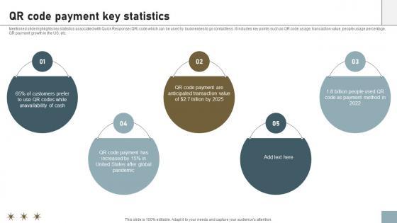 Mentioned slide highlights key statistics associated with Quick Response QR code which can be used by businesses to go contactless. It includes key points such as QR code usage, transaction value, people usage percentage, QR payment growth in the US, etc. Coming up with a presentation necessitates that the majority of the effort goes into the content and the message you intend to convey. The visuals of a PowerPoint presentation can only be effective if it supplements and supports the story that is being told. Keeping this in mind our experts created Online Payment Techniques QR Code Payment Key Statistics to reduce the time that goes into designing the presentation. This way, you can concentrate on the message while our designers take care of providing you with the right template for the situation. Mentioned slide highlights key statistics associated with Quick Response QR code which can be used by businesses to go contactless. It includes key points such as QR code usage, transaction value, people usage percentage, QR payment growth in the US, etc.