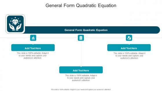 Introducing our well designed General Form Quadratic Equation In Powerpoint And Google Slides Cpb. This PowerPoint design presents information on topics like General Form Quadratic Equation. As it is predesigned it helps boost your confidence level. It also makes you a better presenter because of its high quality content and graphics. This PPT layout can be downloaded and used in different formats like PDF, PNG, and JPG. Not only this, it is available in both Standard Screen and Widescreen aspect ratios for your convenience. Therefore, click on the download button now to persuade and impress your audience. Our General Form Quadratic Equation In Powerpoint And Google Slides Cpb are topically designed to provide an attractive backdrop to any subject. Use them to look like a presentation pro.