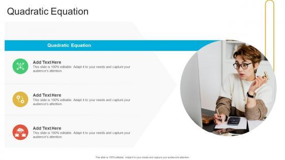 Introducing our well-designed Quadratic Equation In Powerpoint And Google Slides Cpb. This PowerPoint design presents information on topics like Quadratic Equation. As it is predesigned it helps boost your confidence level. It also makes you a better presenter because of its high-quality content and graphics. This PPT layout can be downloaded and used in different formats like PDF, PNG, and JPG. Not only this, it is available in both Standard Screen and Widescreen aspect ratios for your convenience. Therefore, click on the download button now to persuade and impress your audience. Our Quadratic Equation In Powerpoint And Google Slides Cpb are topically designed to provide an attractive backdrop to any subject. Use them to look like a presentation pro.