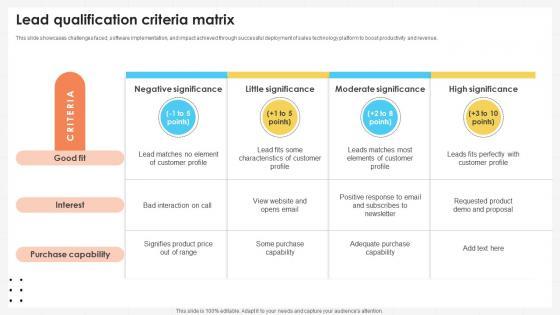 This slide showcases challenges faced, software implementation, and impact achieved through successful deployment of sales technology platform to boost productivity and revenue. Retrieve professionally designed Business Development Team Lead Qualification Criteria Matrix SA SS V to effectively convey your message and captivate your listeners. Save time by selecting pre-made slideshows that are appropriate for various topics, from business to educational purposes. These themes come in many different styles, from creative to corporate, and all of them are easily adjustable and can be edited quickly. Access them as PowerPoint templates or as Google Slides themes. You do not have to go on a hunt for the perfect presentation because Slidegeeks got you covered from everywhere. This slide showcases challenges faced, software implementation, and impact achieved through successful deployment of sales technology platform to boost productivity and revenue.