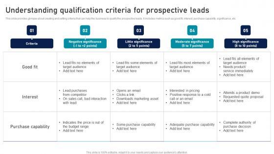 This slide provides glimpse about creating and setting criteria that can help the business to qualify the prospective leads. It includes metrics such as good fit, interest, purchase capability, significance, etc. Create an editable Enhance Customer Retention Understanding Qualification Criteria For Prospective Leads Topics Pdf that communicates your idea and engages your audience. Whether you are presenting a business or an educational presentation, pre-designed presentation templates help save time. Enhance Customer Retention Understanding Qualification Criteria For Prospective Leads Topics Pdf is highly customizable and very easy to edit, covering many different styles from creative to business presentations. Slidegeeks has creative team members who have crafted amazing templates. So, go and get them without any delay. This slide provides glimpse about creating and setting criteria that can help the business to qualify the prospective leads. It includes metrics such as good fit, interest, purchase capability, significance, etc.