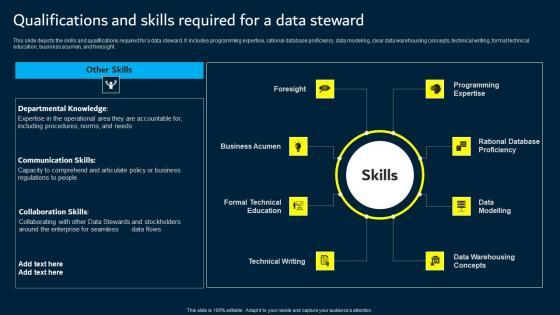 This slide depicts the skills and qualifications required for a data steward. It includes programming expertise, rational database proficiency, data modeling, clear data warehousing concepts, technical writing, formal technical education, business acumen, and foresight. Formulating a presentation can take up a lot of effort and time, so the content and message should always be the primary focus. The visuals of the PowerPoint can enhance the presenters message, so our Qualifications And Skills Required For A Data Steward Data Custodianship Diagrams Pdf was created to help save time. Instead of worrying about the design, the presenter can concentrate on the message while our designers work on creating the ideal templates for whatever situation is needed. Slidegeeks has experts for everything from amazing designs to valuable content, we have put everything into Qualifications And Skills Required For A Data Steward Data Custodianship Diagrams Pdf This slide depicts the skills and qualifications required for a data steward. It includes programming expertise, rational database proficiency, data modeling, clear data warehousing concepts, technical writing, formal technical education, business acumen, and foresight.