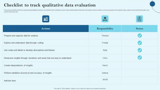 The purpose of this slide is to represent qualitative analysis checklist to track activities and to keep stakeholders informed. It includes various actions such as prepare and organize data, explore and understand data, use codes and labels etc. Pitch your topic with ease and precision using this Checklist To Track Qualitative Data Evaluation Microsoft Pdf This layout presents information on Prepare And Organize, Data For Analysis, Responsibility It is also available for immediate download and adjustment. So, changes can be made in the color, design, graphics or any other component to create a unique layout. The purpose of this slide is to represent qualitative analysis checklist to track activities and to keep stakeholders informed. It includes various actions such as prepare and organize data, explore and understand data, use codes and labels etc.