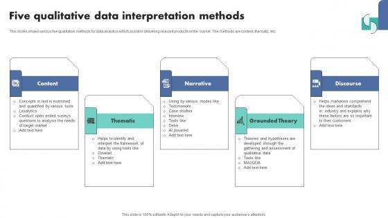 This slides shows various five qualitative methods for data analytics which assist in delivering relevant products in the market. The methods are content, thematic, etc.Showcasing this set of slides titled Five Qualitative Data Interpretation Methods Diagrams Pdf The topics addressed in these templates are Concepts Text, Examined, Theories Hypotheses All the content presented in this PPT design is completely editable. Download it and make adjustments in color, background, font etc. as per your unique business setting. This slides shows various five qualitative methods for data analytics which assist in delivering relevant products in the market. The methods are content, thematic, etc.