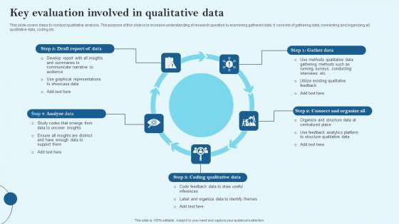 This slide covers steps to conduct qualitative analysis. The purpose of this slide is to increase understanding of research question by examining gathered data. It consists of gathering data, connecting and organizing all qualitative data, coding etc. Showcasing this set of slides titled Key Evaluation Involved In Qualitative Data Infographics Pdf The topics addressed in these templates are Analyze Data, Coding Qualitative Data, Gather Data All the content presented in this PPT design is completely editable. Download it and make adjustments in color, background, font etc. as per your unique business setting. This slide covers steps to conduct qualitative analysis. The purpose of this slide is to increase understanding of research question by examining gathered data. It consists of gathering data, connecting and organizing all qualitative data, coding etc.